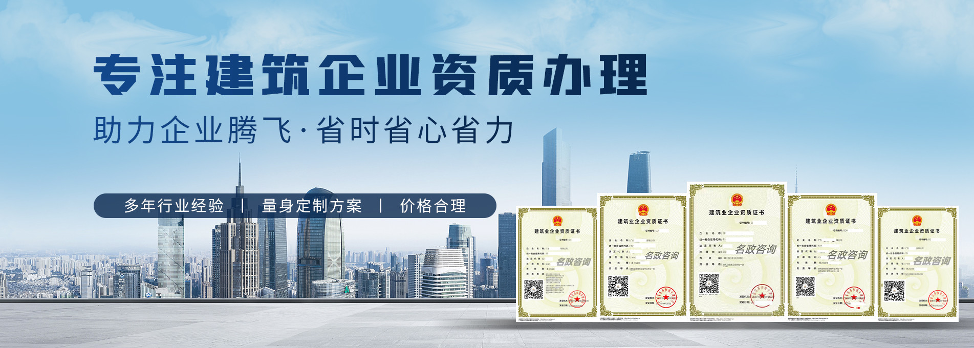 名政咨詢(xún)—因?yàn)閷?zhuān)注、所以專(zhuān)業(yè)辦理建筑施工總承包、專(zhuān)業(yè)承包、施工勞務(wù)企業(yè)、建筑設(shè)計(jì)、安全生產(chǎn)許可證等資質(zhì)新辦、延續(xù)就位、升級(jí)、增項(xiàng)、維護(hù);資質(zhì)收購(gòu)、轉(zhuǎn)讓等相關(guān)咨詢(xún)服務(wù)。